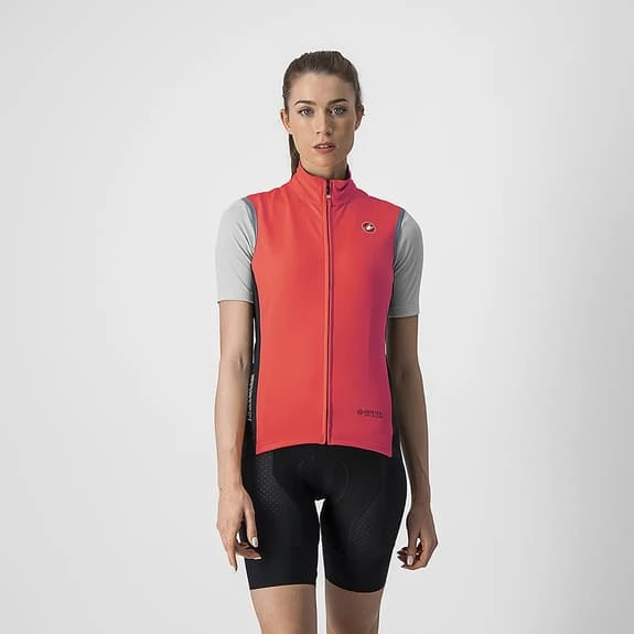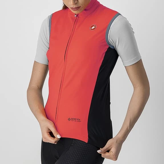 Il gilet Castelli Perfetto RoS GORE-TEX INFINIUMâ„¢ Rosso Corsa da donna con tessuto GORE-TEX INFINIUMâ„¢ nella parte anteriore e sulle spalle per offrire la massima protezione dall’acqua e dal vento. Tessuto Nano Flex Light nella parte posteriore assicura la massima traspirabilità . Inoltre, la zona del collo è più alta per proteggerti dal freddo e ha due tasche sulla schiena.