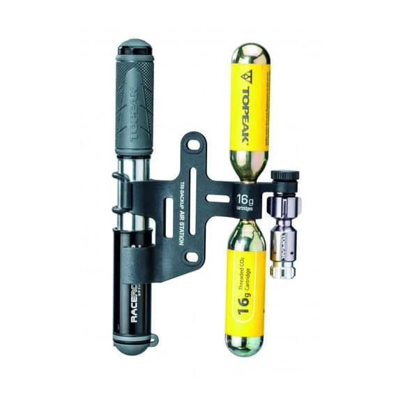 Il supporto di CO2 e pompe manuali Topeak Tri-BackUp sono un sistema completo che Topeak ha integrato attentamente allo stivaggio, all’idratazione e alla riparazione in un’unica soluzione per triatleti. Tri-BackUp è un adattatore per montare un gonfiatore CO2, cartucce di CO2 e una mini pompa.