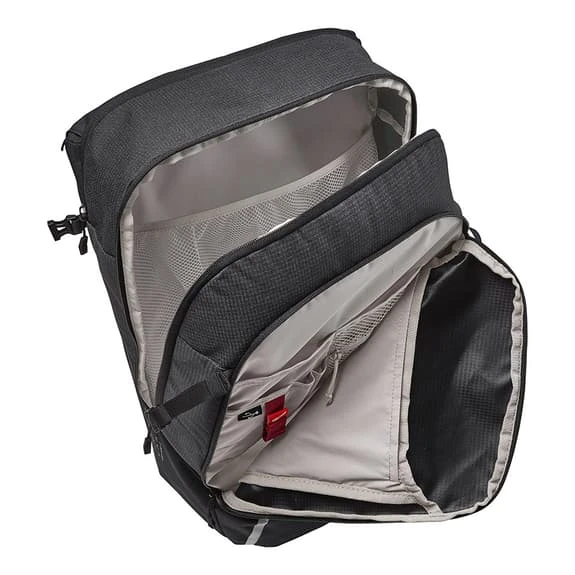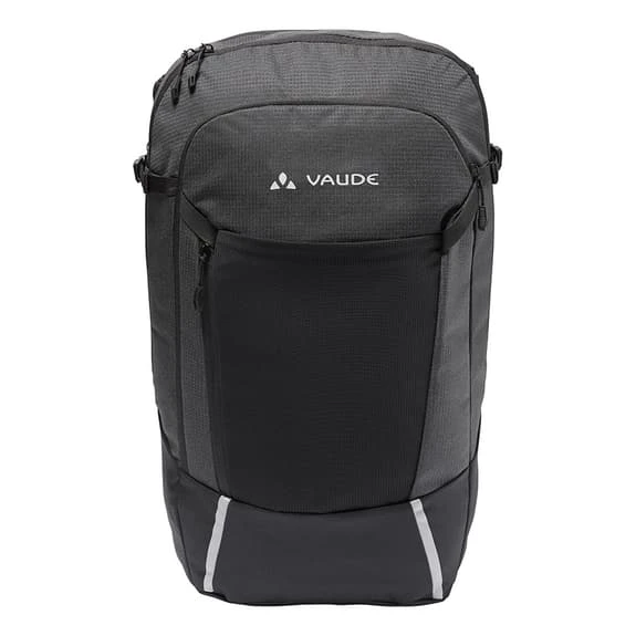 Lo zaino Vaude Cycle II Luminum, con una capacità di 28 litri, può essere utilizzato anche come borsa per chi desidera trasportare il proprio bagaglio durante il tragitto quotidiano in bicicletta. Si aggancia al portapacchi con i sistemi di attacco QMR che possono essere bloccati e riconvertiti rapidamente in uno zaino. Basta aprire le due cerniere verticali e l’intero sistema può essere riposto in uno scomparto con chiusura a velcro. Ha un ampio scomparto principale che può contenere documenti DIN A4, una bottiglia d’acqua, uno snack e un cambio di vestiti. Uno scomparto separato e imbottito con chiusura a zip può contenere computer portatili fino a 15,6 pollici. Lo scomparto anteriore a tutta lunghezza si apre in diagonale e offre un organizzatore in rete per il telefono, le chiavi e il portafoglio. Questo scomparto è dotato anche di una tasca piatta in rete per riporre rapidamente una rivista o i vestiti bagnati. Due cinghie di compressione laterali, un supporto per il casco e la copertura antipioggia inclusa completano le pratiche caratteristiche di questo zaino. Il materiale principale del Cycle II Luminum è costituito per il 50% da poliestere riciclato, mentre il materiale di contrasto è riciclato al 100%. Qualità Eco Finish 100% senza fluorocarburi. Questo prodotto è neutrale dal punto di vista climatico, poiché tutte le emissioni derivanti dai materiali, dalla produzione e dalla spedizione sono state sistematicamente analizzate da Vaude e ridotte. Le emissioni attualmente inevitabili sono state completamente compensate dall’organizzazione indipendente no-profit myclimate.